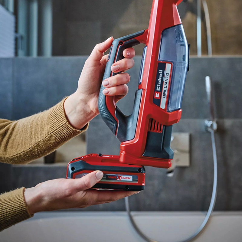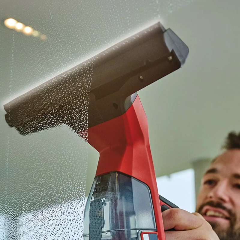 Streak-free windows in no time – this is no work at all for the Einhell cordless window cleaner BRILLIANTO. As part of the Power X-Change family, the cordless window cleaner can be combined with all batteries and chargers. Cordless window cleaning without interruptions: This is made possible by the Power X-Change exchangeable battery system and high-speed charging technology. If the battery used is empty, it can easily be exchanged for a full one – so there are no limits to the runtime. The cordless window cleaner BRILLIANTO comes with a 300 ml spray bottle. The microfibre cloth included is attached to these to easily clean glass surfaces. The remains of the water are then collected by the window cleaner with the help of its 28 cm long suction nozzle. The perfect interaction between the nozzle and the one-piece silicone pull-off lip ensures streak-free results – regardless of whether glass surfaces are cleaned in the horizontal, vertical or diagonal direction. This makes the cordless window cleaner an all-rounder – not only used for window cleaning, but also for cleaning tiles, showers, glass tables, windows and windows in the car, large window fronts, etc. Up to 100 ml of liquid can be collected in the wastewater tank. For emptying and cleaning, the tank can be completely removed from the device. Thanks to its lightweight and compact design with special softgrip surfaces, the window cleaner sits comfortably in the hand without slipping. The on/off switch is equipped with a continuous running function for time-consuming cleaning work. The cordless window cleaner is stored in the supplied wall bracket in a simple and space-saving way. The BRILLIANTO is supplied without a battery or charger. These are available separately, e.g. as a practical starter set. A telescopic rod set for cleaning high windows, a nozzle set for cleaning narrow and large glass surfaces and a protective battery cover are also available separately as practical accessories for the Einhell cordless window cleaner BRILLIANTO.
