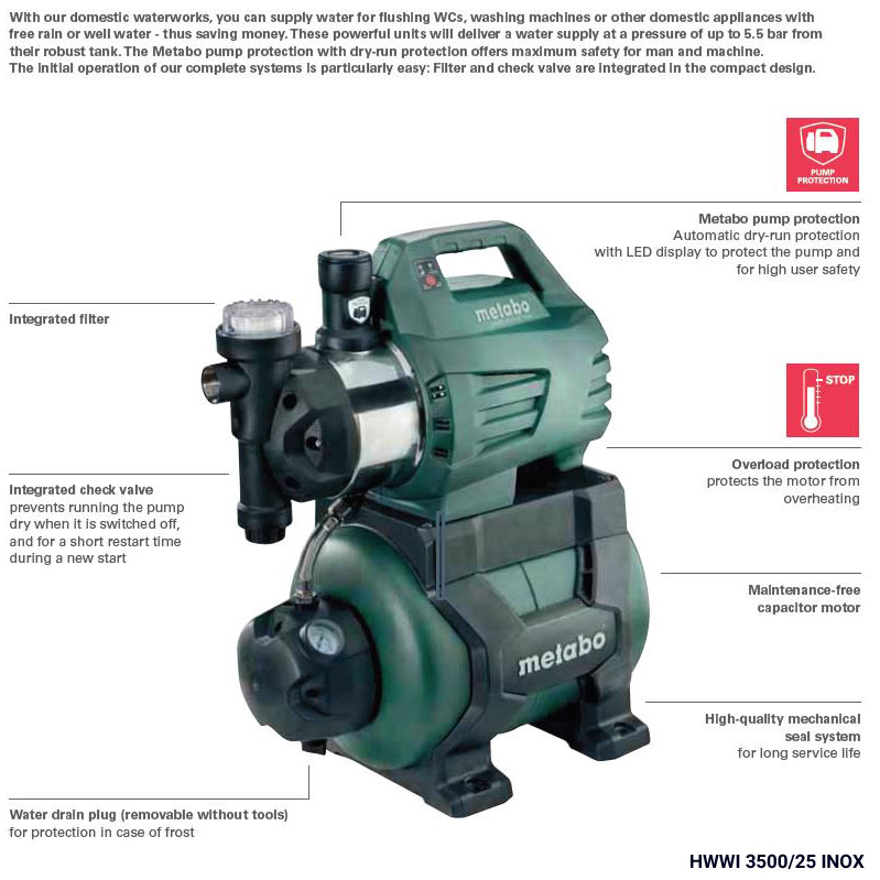 - Metabo pump protection: automatic dry-run protection with LED display to protect the pump and high user safety