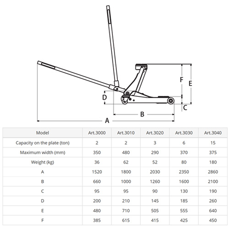 OMCN Hydraulic Trolley Garage Jack TJ-ART3010 2 TON HYDRAULIC TROLLEY GARAGE JACK – LIFTING HT: MAX 350MM CATALOGUE SKU: OMC-TJ-ART3010 Categories: Hydraulic Equipment's, Hydraulic Tools Tag: HYDRAULIC Product Inquiry Your Name (required) Your Email (required) Subject Your Message Δ Features Tech Spec Features Technical and structural layout:Completely innovative design.Very low profile.Ergonomic handle.Support holder with wide base.Rubber covered support.Nylon wheels (for Art. 3000).Equipped with double frontal balancing rolls and rear turning wheels in polyurethane (for Art. 3010).Foot descent-control (for Art. 3010).Hand descent-control (for Art. 3000). Tech Spec ModelART3010Capacity on the plate2 TonMaximum width480 mmWeight67 kg Opens in a new window Share on Facebook Opens in a new window Mail This Product Related products Quick View Quick View OMCN 20 Ton Bottle Jack – Closed Piston 285mm Piston Stroke165mm BJ – ART129 Quick View Quick View OMCN Manual & Electric Hydraulic Press HP-Art.153 Quick View Quick View TLP Hydraulic Busbar Puncher Quick View Quick View OMCN 1000kg Hydraulic Foldable Floor Crane FC-GP10DE