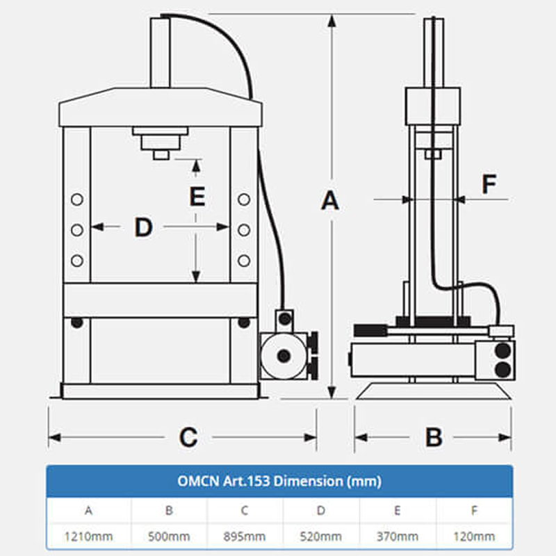 OMCN Manual & Electric Hydraulic Press HP-Art.153 10 TON HYDRAULIC PRESS C/W V-BLOCK & PLATE (ITALY) CATALOGUE SKU: OMC-HP-ART153 Category: Hydraulic Equipment's Tag: HYDRAULIC PRESS Product Inquiry Your Name (required) Your Email (required) Subject Your Message Δ Features Tech Spec Features Compact and sturdy structure fully made of welded steel Shafts made of specially treated and chromium-plated steel Spring made of steel inside the cylinder for a rapid return of the shaft Two-speed manual pump: fast when approaching and precise when working Knob on the pump to control both speeds Maximum versatility thanks to the height-adjustable table Supplied with a pin-extracting plate and a pair of V-blocks Tech Spec Model ART153 Capacity 10 Ton Piston stroke 190 mm Weight 104 kg Dimensions 895 x 500 x 1210 Opens in a new window Share on Facebook Opens in a new window Mail This Product Related products Quick View Quick View Customised Safety Guard for OMCN Hydraulic Press Quick View Quick View OMCN Electro-Hydraulic Press 100 Ton ( ART.164/R ) Quick View Quick View TLP HUANHU Electro-Hydraulic Rebar Cutter (HHG-25D) Quick View Quick View TLP Low Height Telescopic Cylinders