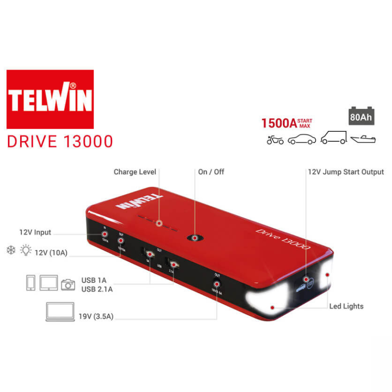 Fit with two USB outputs (1A-2,1A) to charge (power bank) electronic devices (tablets, smartphones, MP3 players, notebooks, cameras etc.), two 12/19V outputs to power laptops and other devices and two high intensity emergency LED lights.