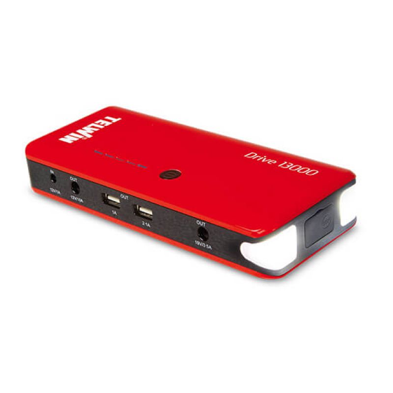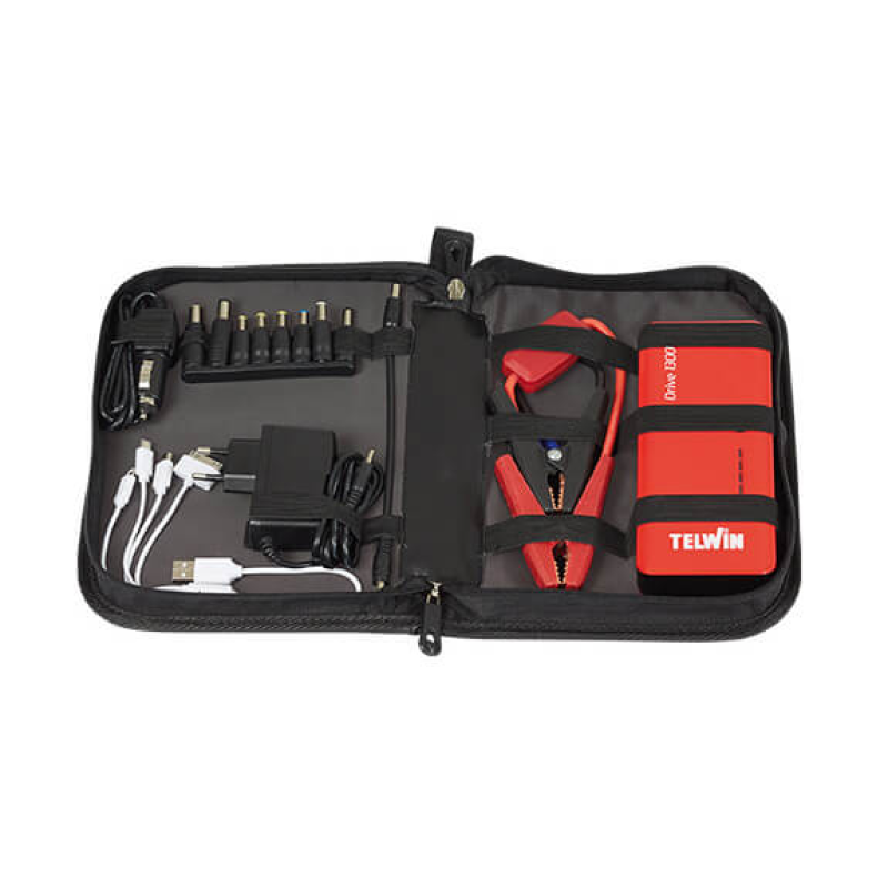 Complete with starting cables, various connectors for mobile devices, cigarette lighter plug and wall charge.